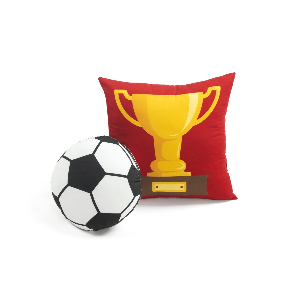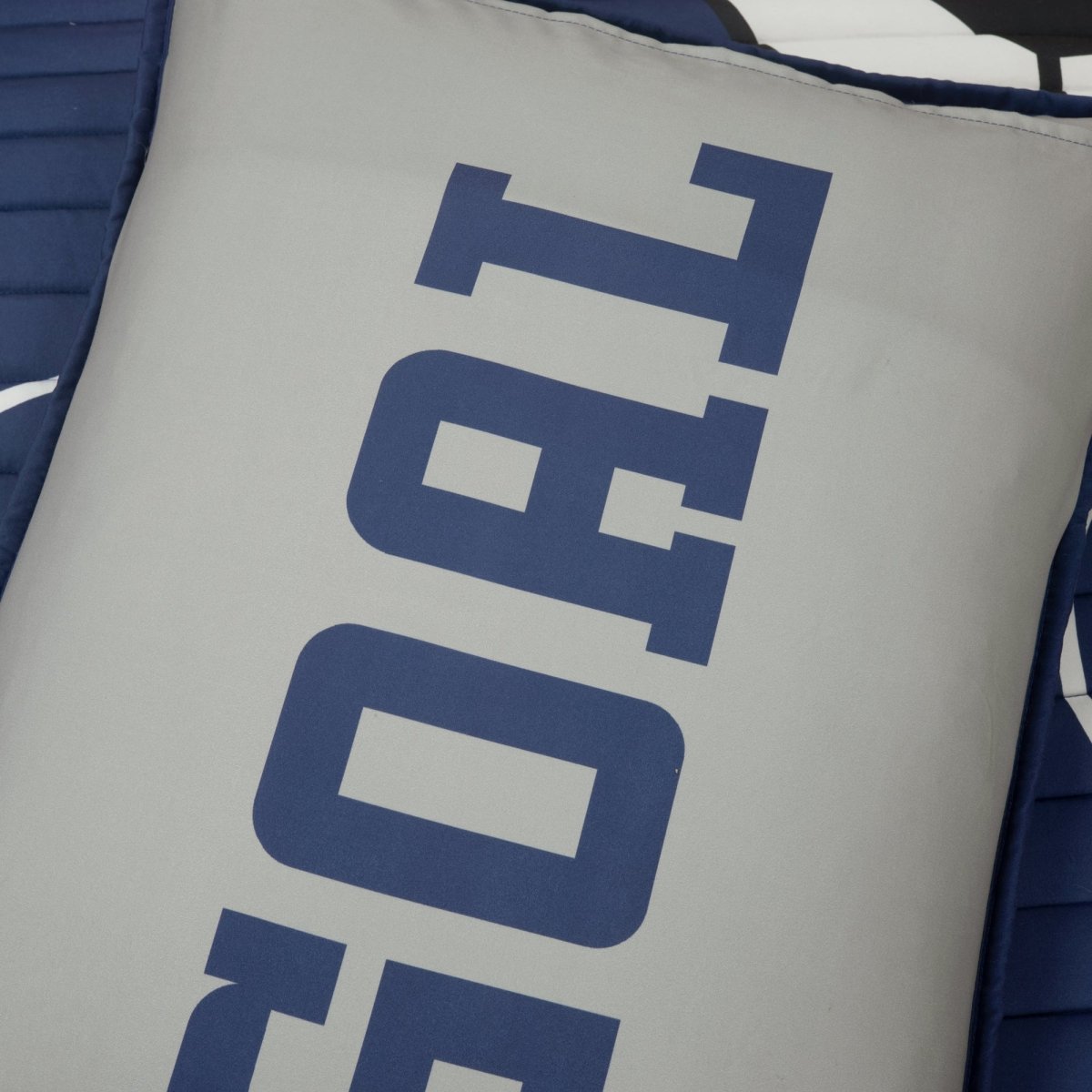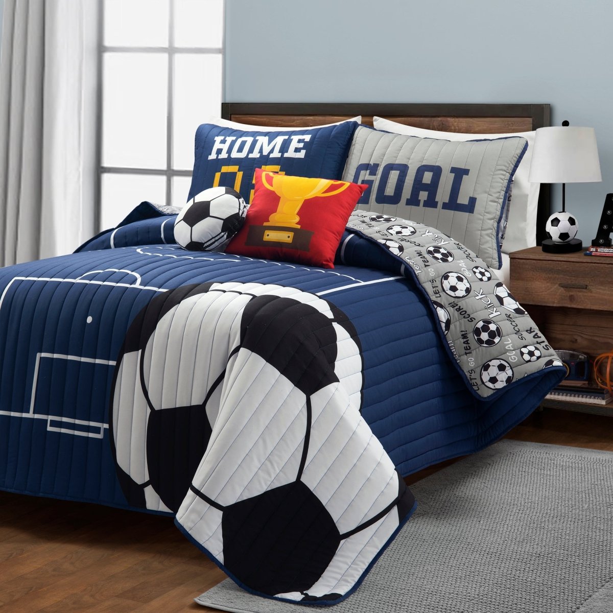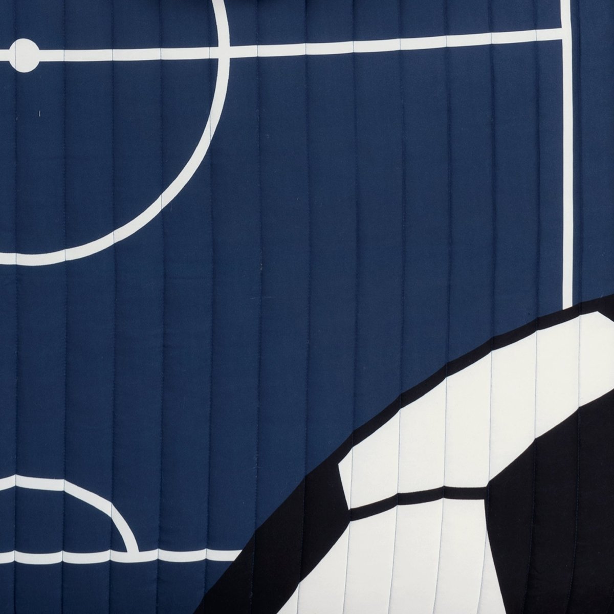 Reversible kids quilt set featuring a bold soccer field and graphic design. Includes oversized quilt, two shams, and two decorative pillows for a sporty look.