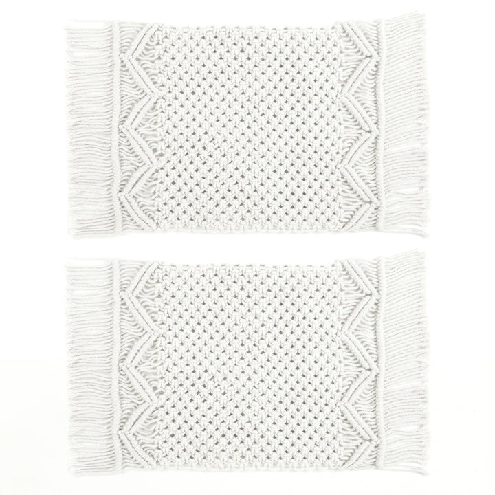 These placemats are sold in a set of two. Each placemat is rectangular and measures 12 inches long and 18 inches wide, plus a 3-inch fringe on each side. Pair this Boho Macrame Indoor/Outdoor Placemat 2-Pack Set with our matching table runner and window treatments for a complete and coordinated look. These items make excellent housewarming gifts for anyone moving into a new home.