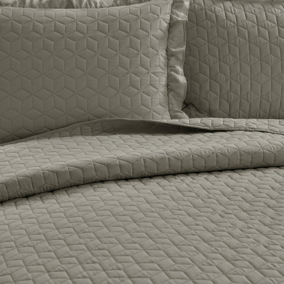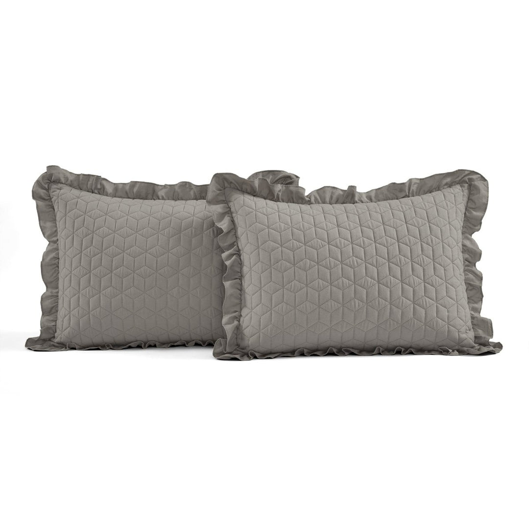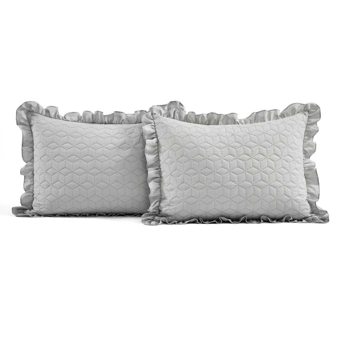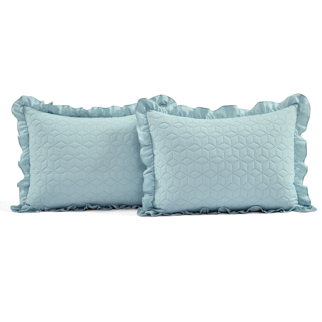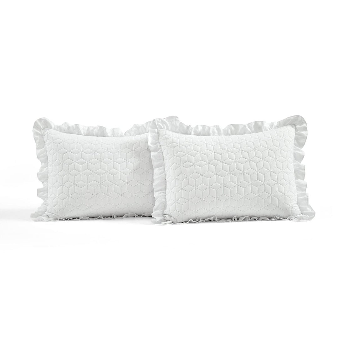 Refresh your master or guest bedroom with this French Country Geo Ruffle Skirt 3 Piece Bedspread Set featuring embossed geometric quilting detail and fitted ruffle skirt that kisses the floor. This set is made with soft crinkle microfiber and includes 2 matching pillow shams with ruffle trim.