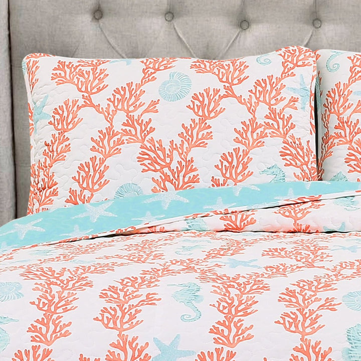 Jeder Strandliebhaber würde dieses dreiteilige Dina Coral Quilt-Set für sein Schlafzimmer lieben. Es ist auch eine großartige Option für ein Gästezimmer oder jeden Raum in einem echten Strandhaus.