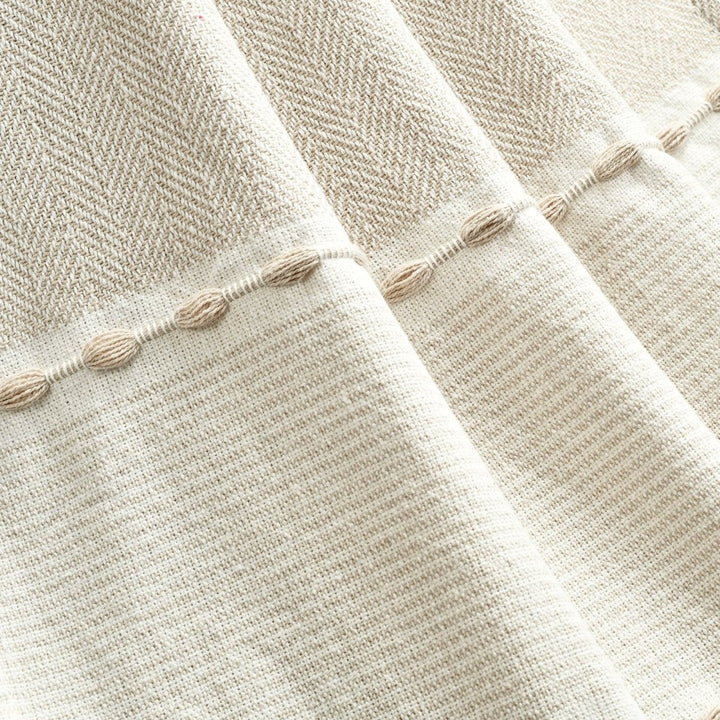 Die Auswahl an neutralen Farben und sein schlichtes, aber stilvolles Design machen es einfach, diesen Überwurf in viele Dekorationsthemen einzufügen, von Boho über Bauernhaus bis hin zu Hygge, um nur einige zu nennen. Die horizontal über den Quastenüberwurf mit Fischgrätenstreifen aus garngefärbter Baumwolle verlaufenden Büschel geben als ob Sie Ihrem Raum eine zusätzliche Struktur verleihen möchten.