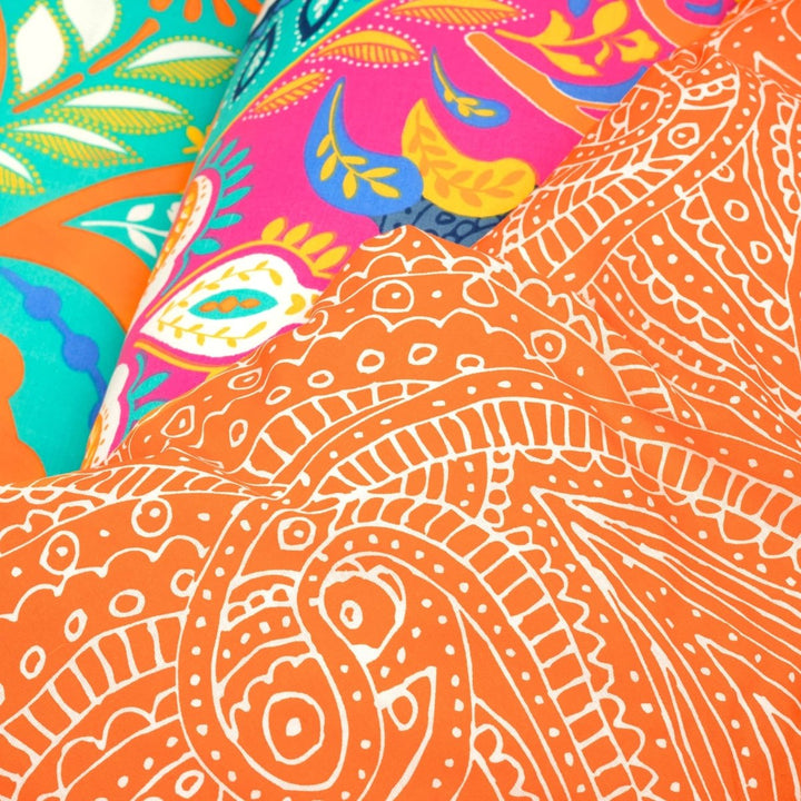 Feiern Sie die kühne und farbenfrohe Seite des Boho-Stils mit diesem lebendigen dreiteiligen Boho-Chic-Bettbezugset aus Baumwolle. Das Paisley-inspirierte Design zieht Sie mit seinen wirbelnden Farbtönen und künstlerischen Details in seinen Bann. Es wird die Stimmung in jedem Schlafzimmer aufhellen.