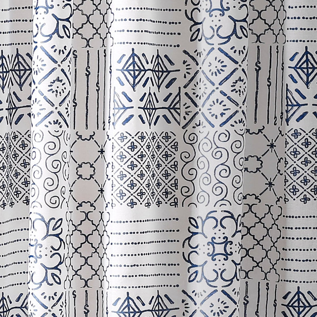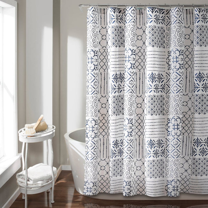 Unser Duschvorhang Monique zeigt ein blau-weißes Patchwork-Design mit geometrischen Mustern, das auf Mikrofaser gedruckt ist. Mit diesem Look bringen Sie Landhausstil in Ihr Haupt- oder Gästebadezimmer.