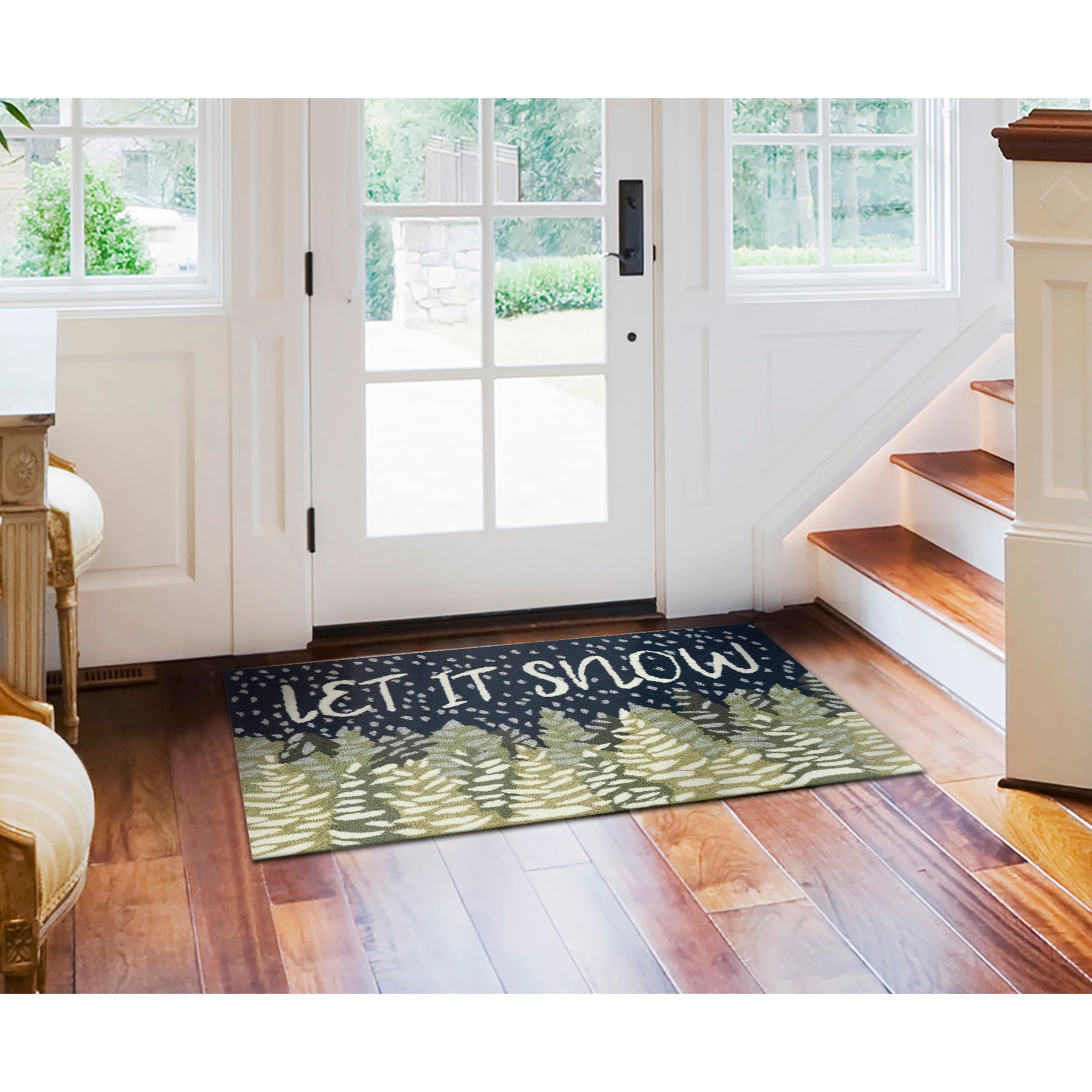 The Let It Snow wintery mat depicts a quiet night in the woods. Featuring saturated colors in navy blue, green and white that bring this snowy scene to life. This happy scene makes this mat the perfect accent to welcome guests at your door, at your kitchen sink, or in any space inside or outside your home.