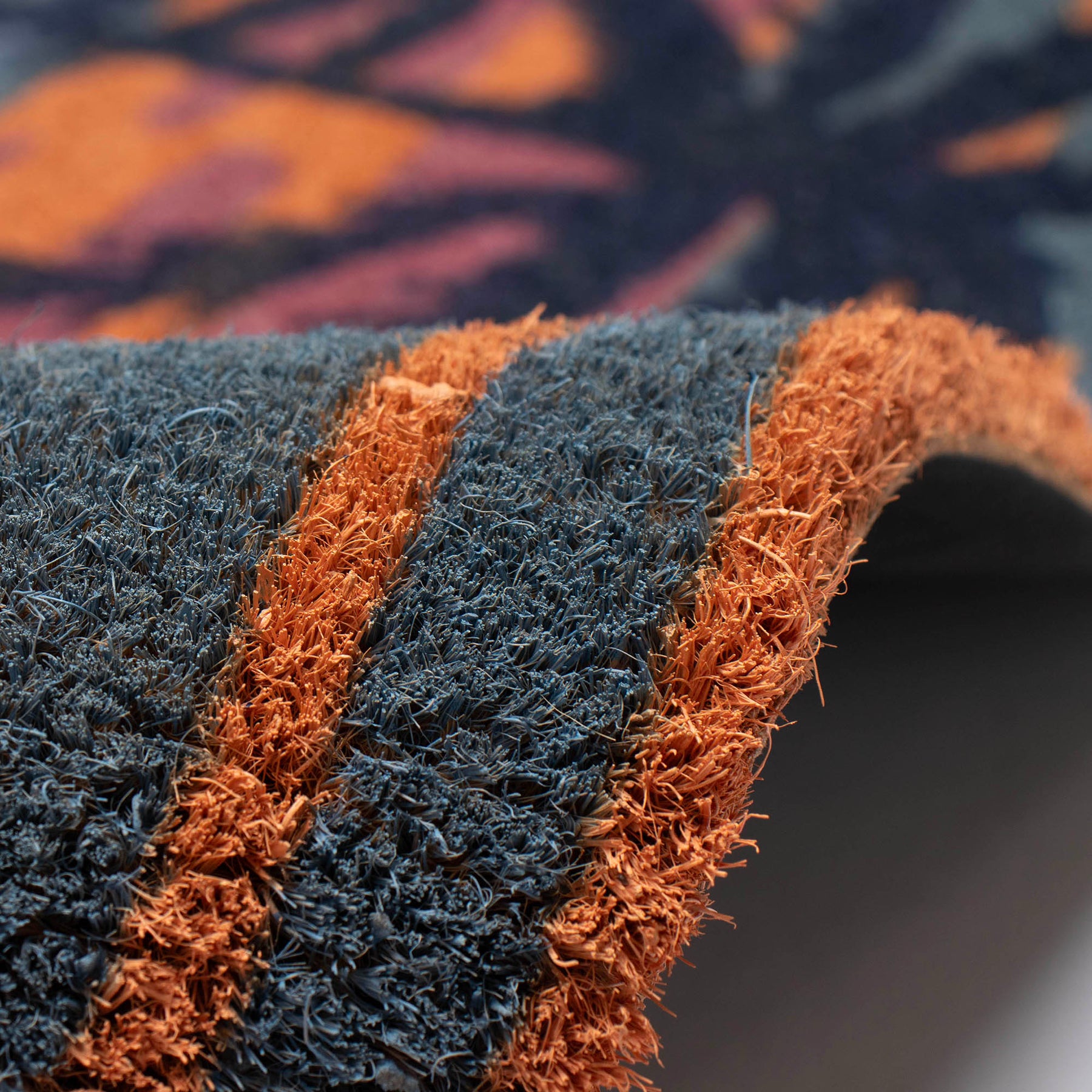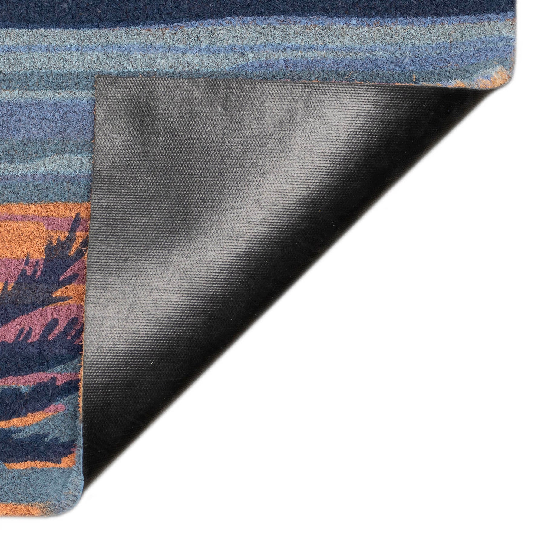 The Sunset coir mat features a twighlight scenery pattern of a multicolor sunset ocean with breezy tropical trees.