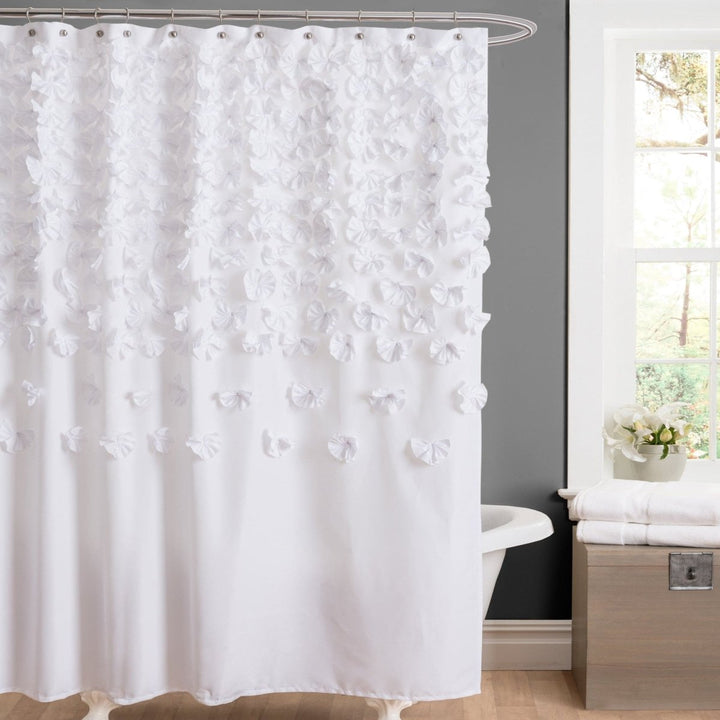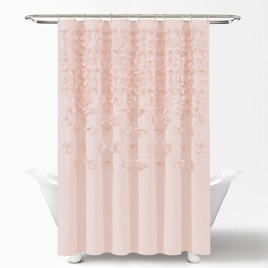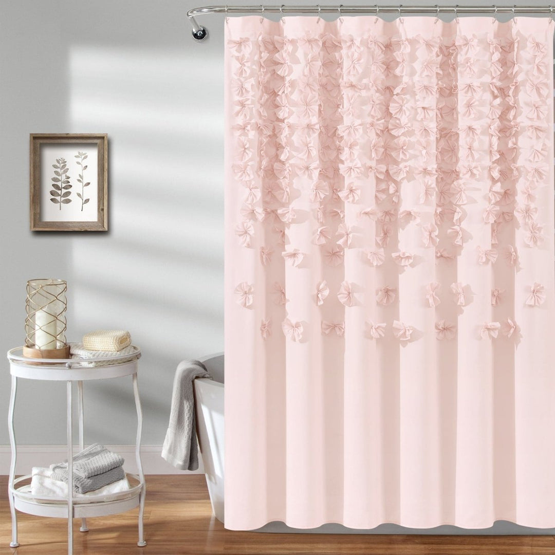 Our Lucia Shower Curtain is made with soft brushed poly and decorated with all handmade bows. It adds a sophisticated and romantic look to your master bathroom or guest bathroom.