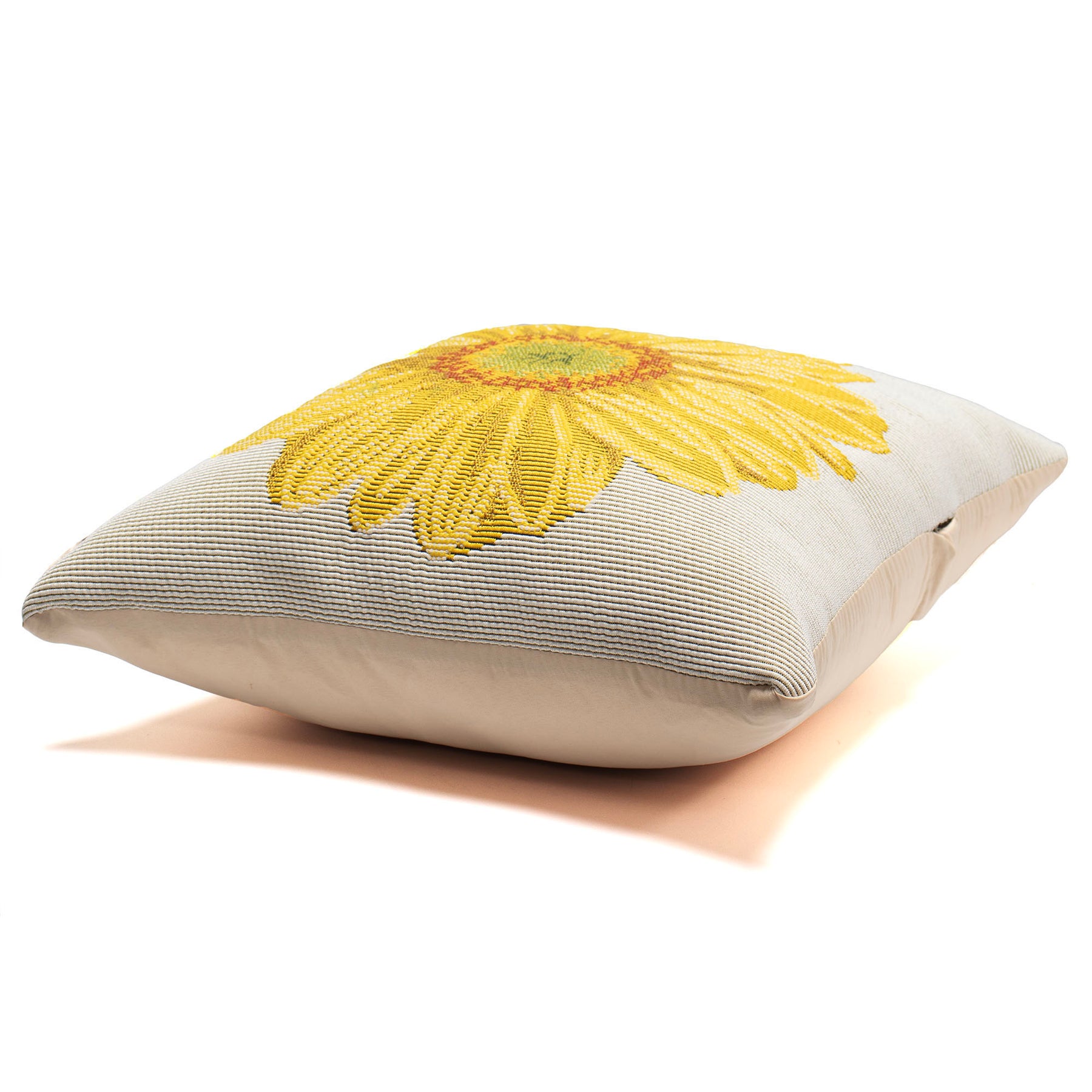 The Yellow Flower pillow features a single golden bloom with yellow shading on the petals and a brown, green and gold center on an ivory background.