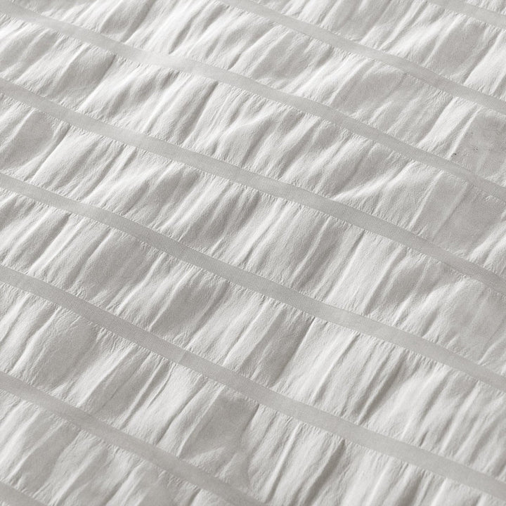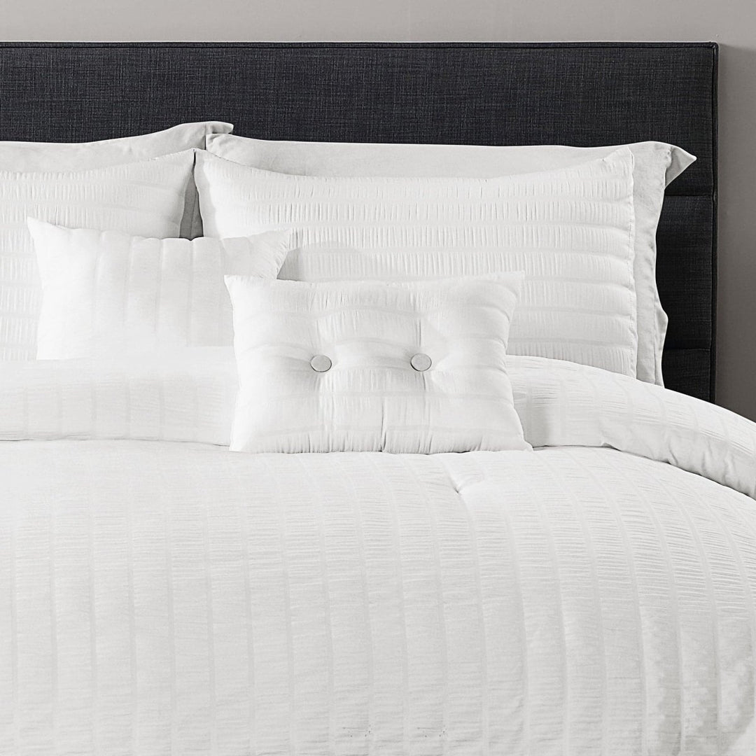 Il set di 5 trapunte Farmhouse Seersucker include un morbido e lussuoso piumone da 200 GSM, due federe abbinate e due cuscini decorativi per dare al tuo letto un aspetto completo e di stile. È disponibile sia nelle misure King che Full/Queen in bianco o grigio chiaro.