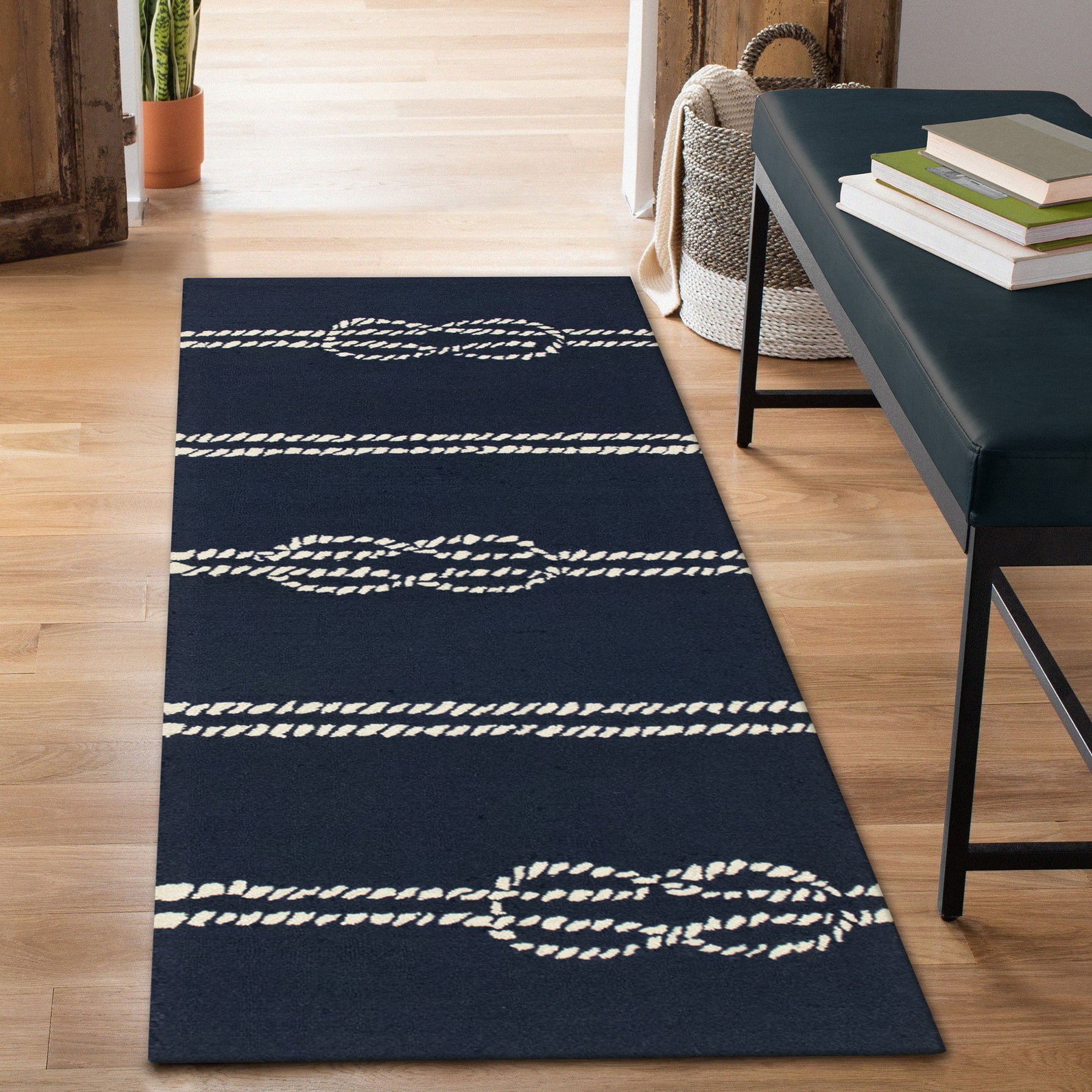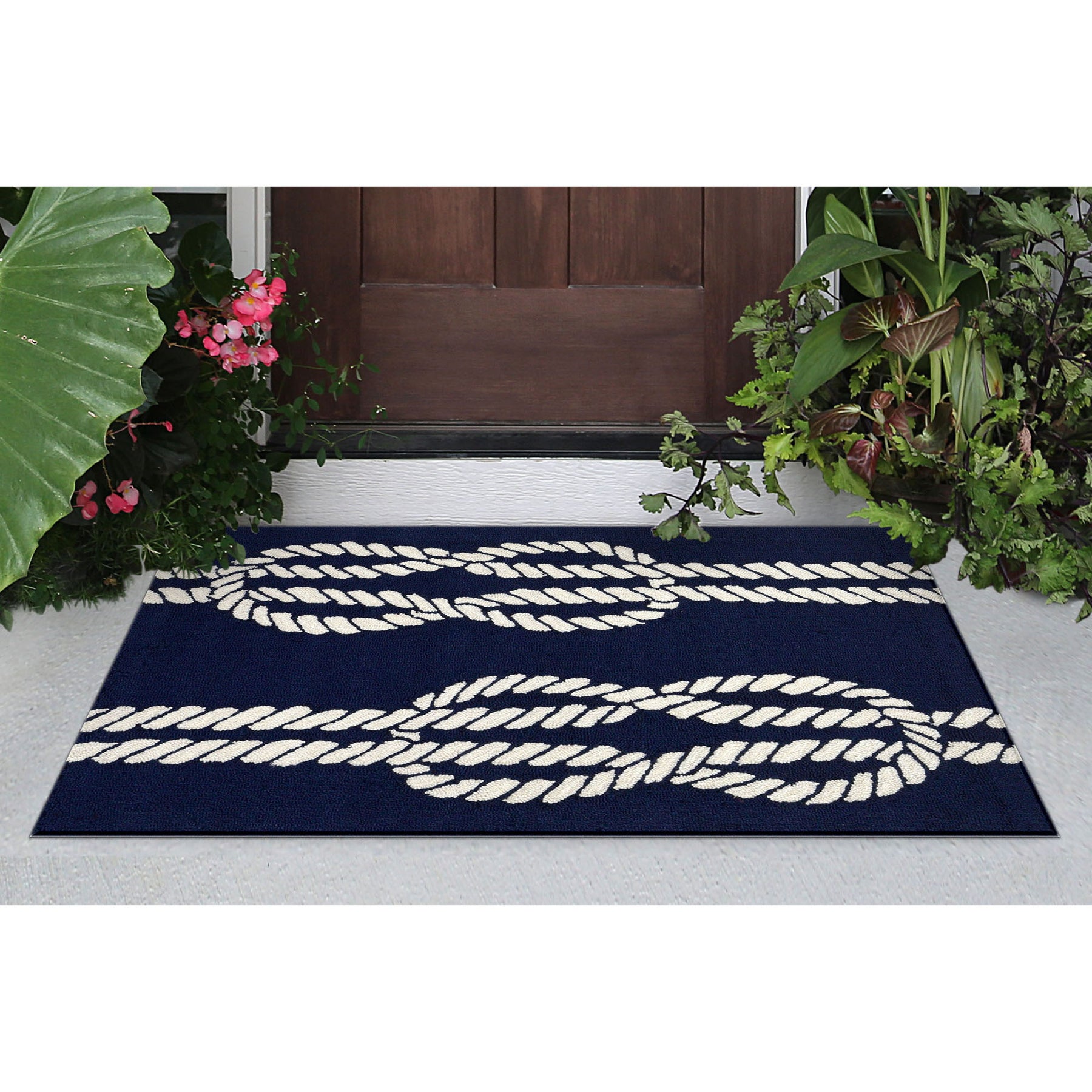 The Ropes transitional decorative area rug features a navy blue background with a simple white rope with a nautical knot detail. A classic sea inspired design will effortlessly compliment any space inside or outside your home.
