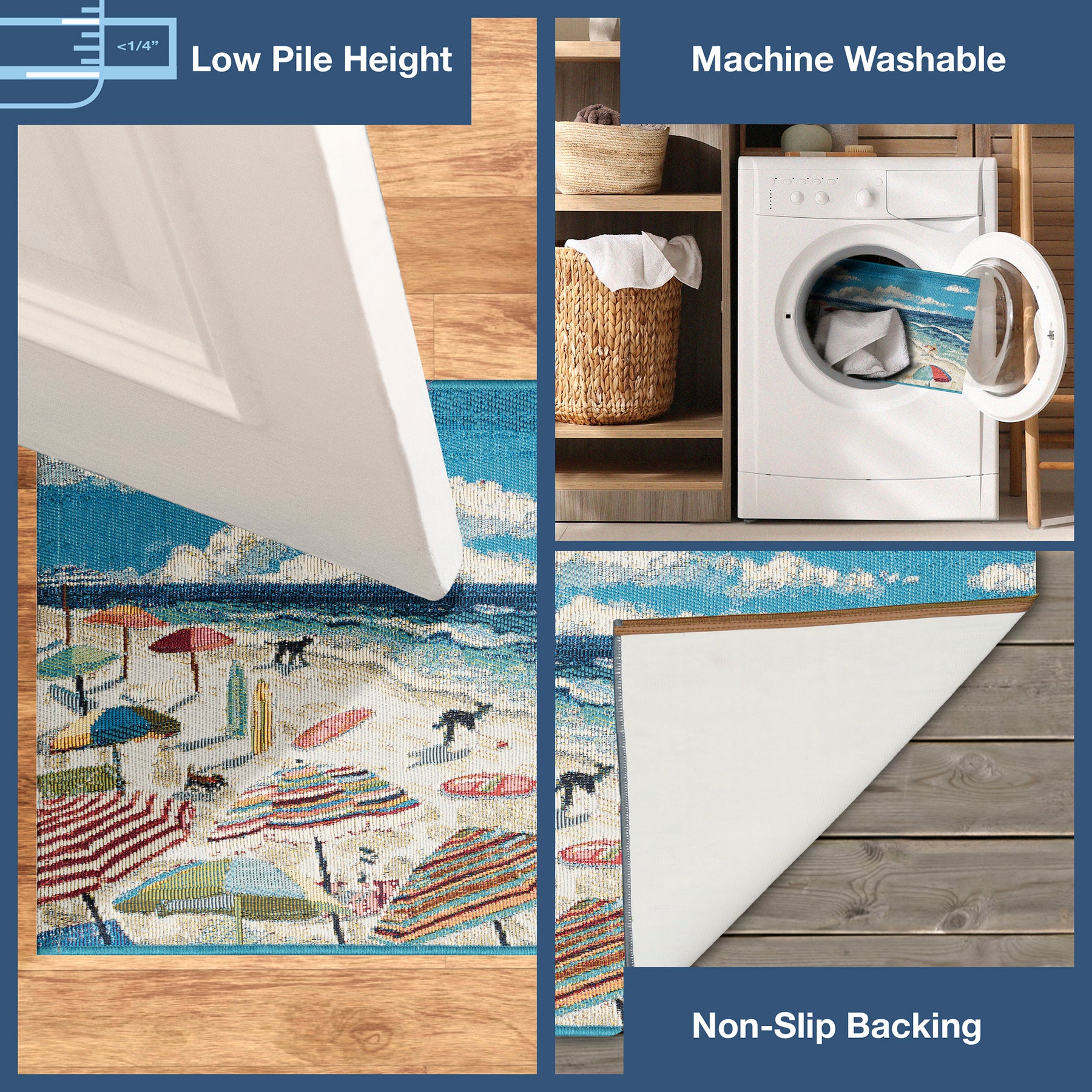 The Dog Beach transitional contemporary coastal novelty mat features a whimsical beach scene with multicolor green, blue, red, orange, yellow striped and color block umbrellas with black dogs on a sandy beach near a blue and navy ocean.