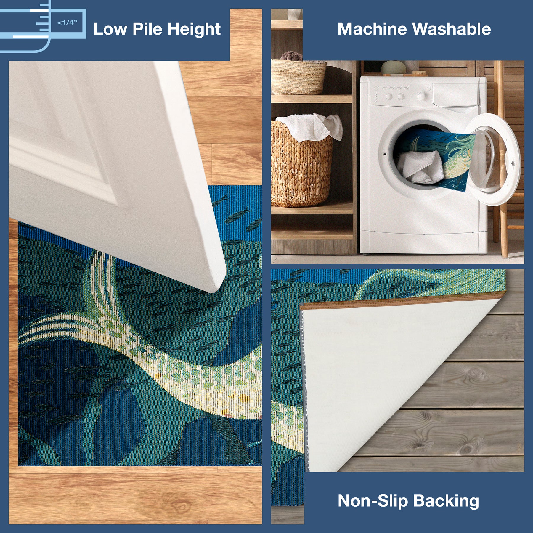 The Mermaids are Real transitional mat featuring a coastal theme with richly blended colors and playful novelty design will delight beach lovers everywhere. The deep-sea blue background with a whimsical ivory mermaid covered in multi colored jewel like scales will effortlessly complement any space inside or outside your home.
