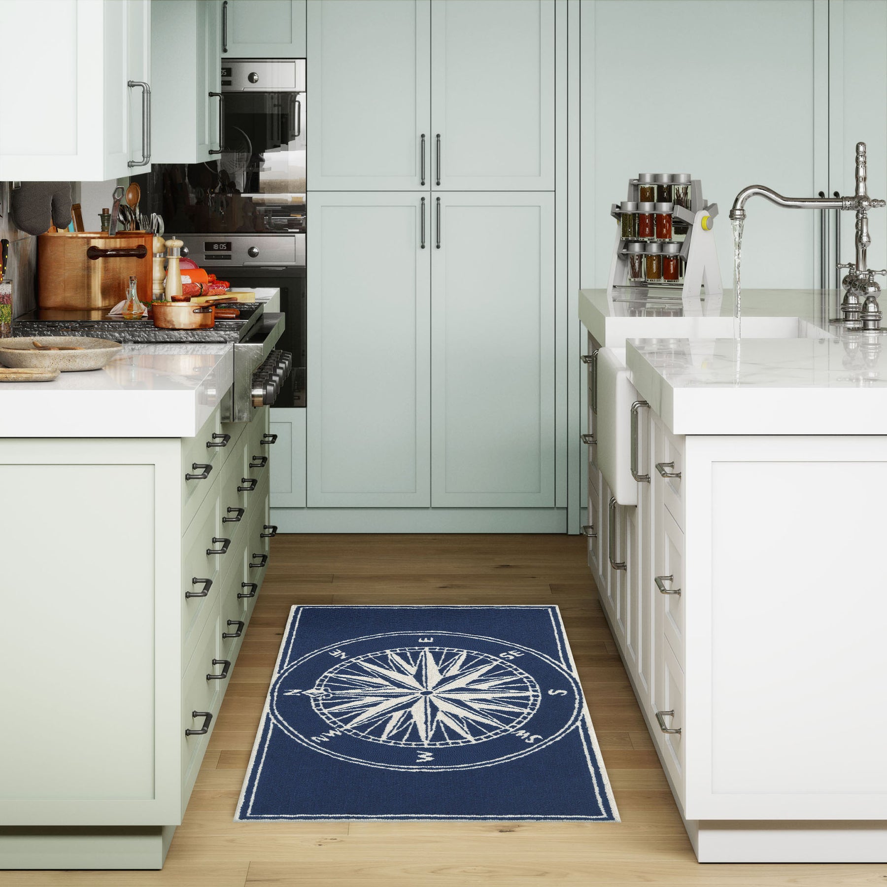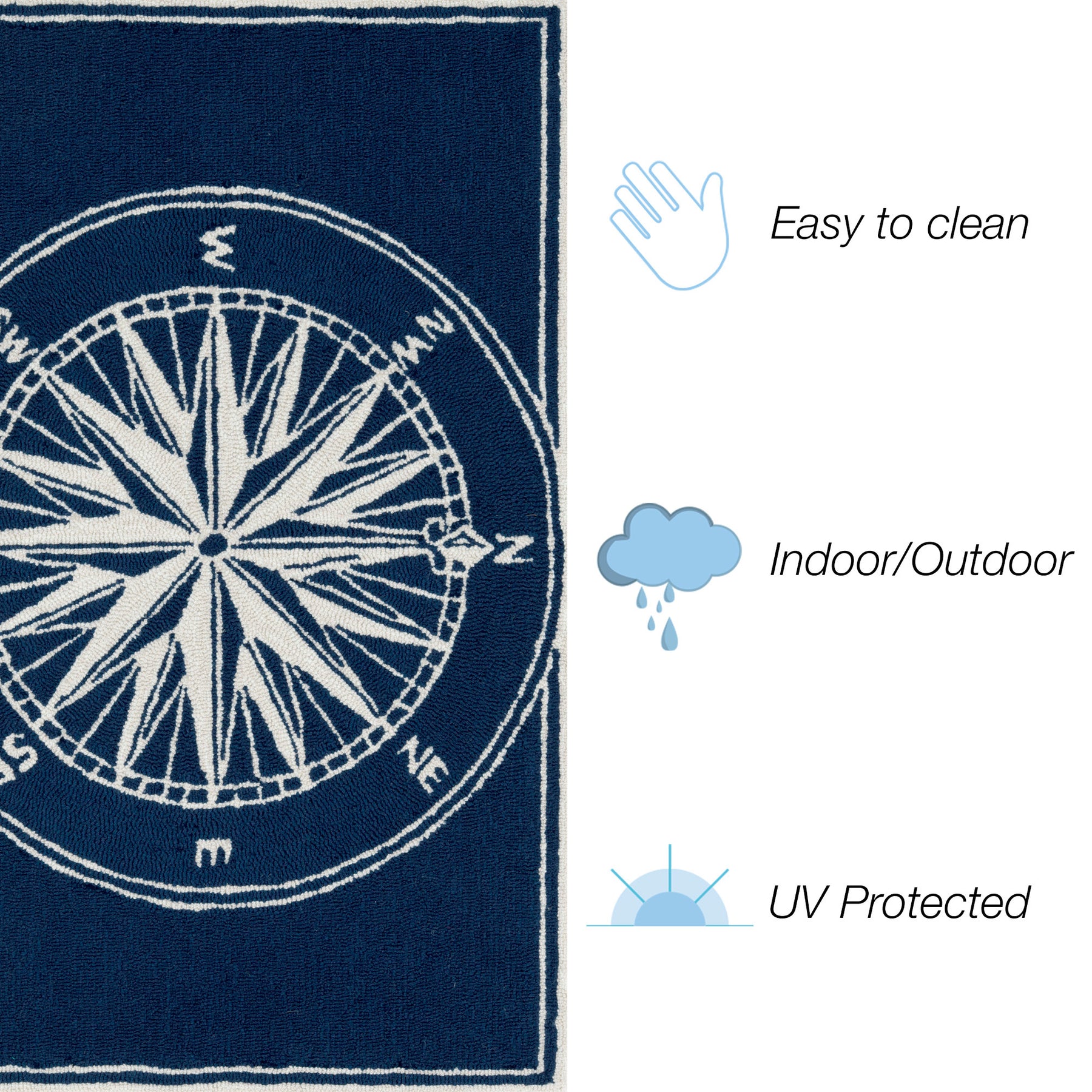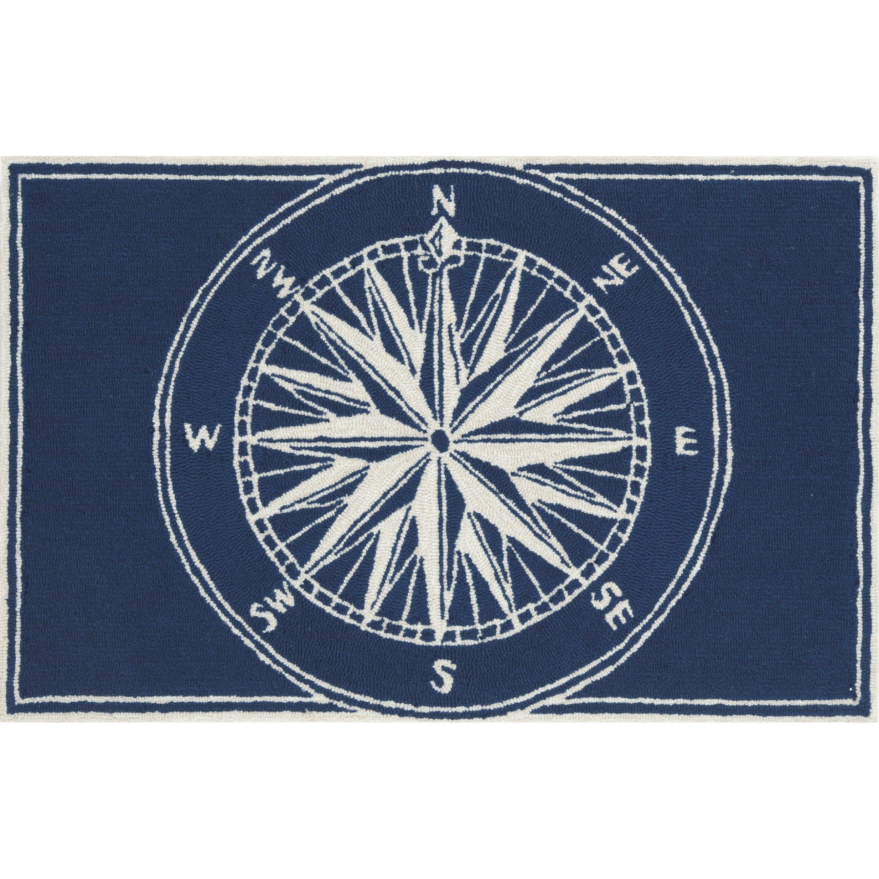 Whether you live near the beach, ocean or just enjoy a seaside lifestyle, this nautical, transitional, sailor-esque themed Compass mat is the perfect accent to your decor, in navy.