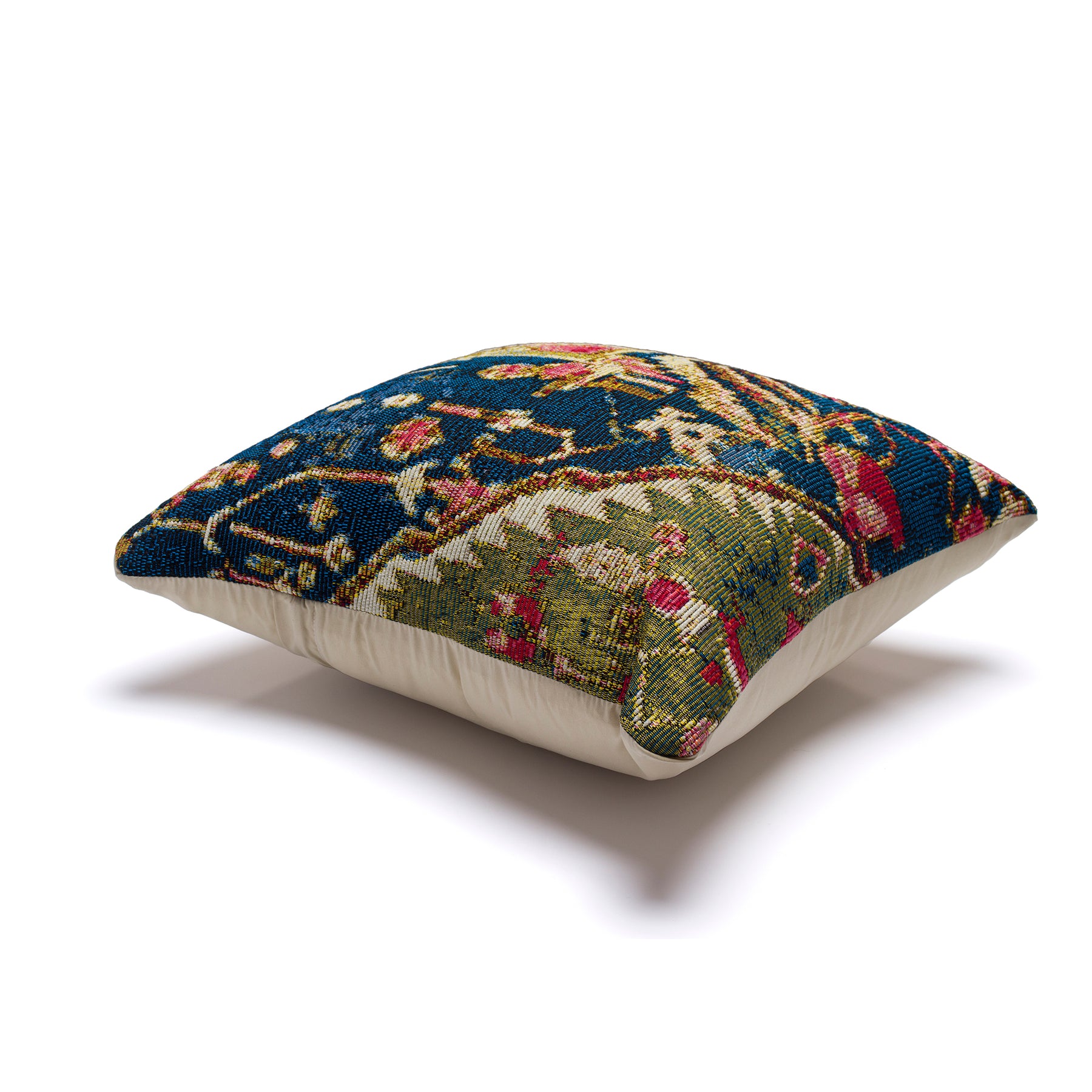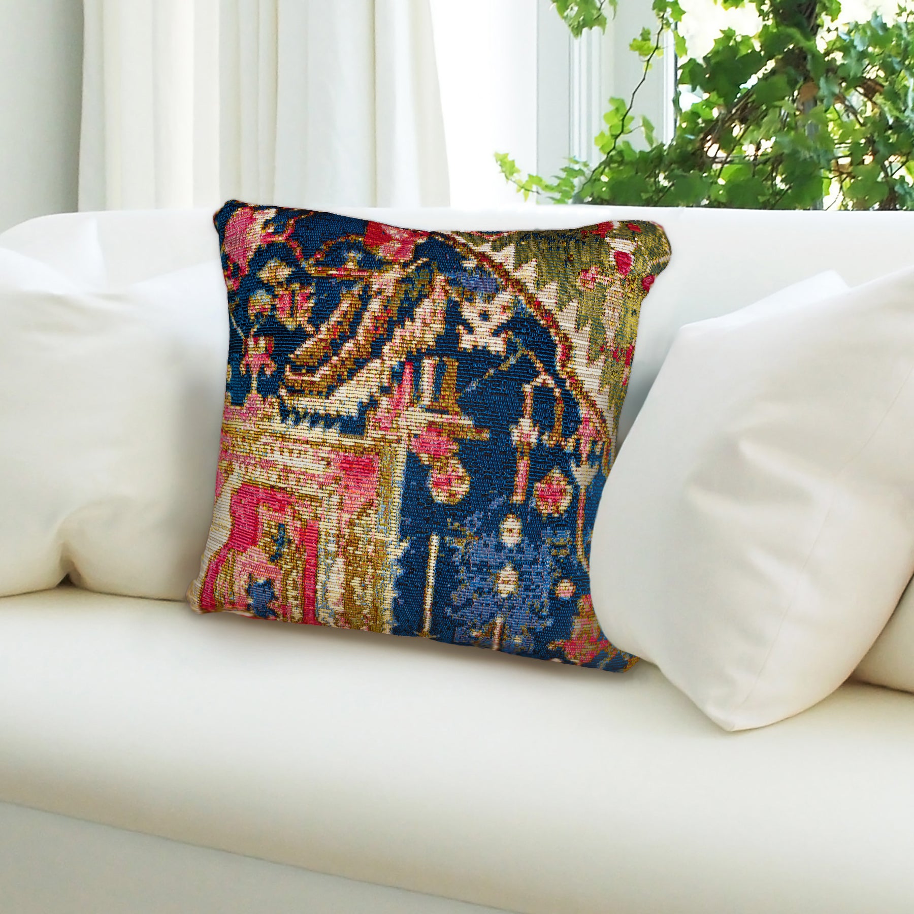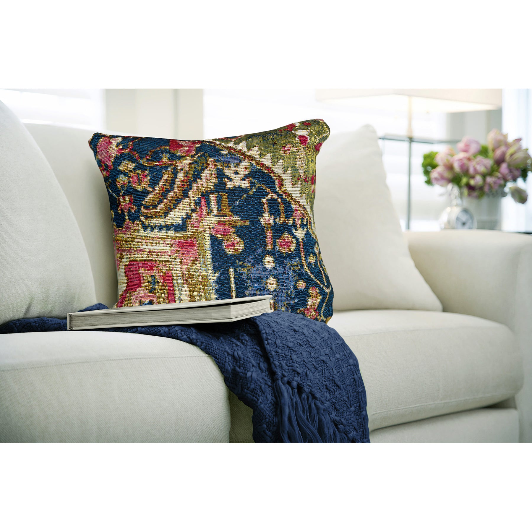 The Heriz decorative transitional pillow is an abstract take on the traditional medallion, bringing a traditional element to your decor without being overly formal. Multiple layers in salmon pink, gold and navy backgrounds are accented with intricate shapes in contrasting colors are designed to appear well loved. This vintage pattern adds instant warmness and textural interest to any space indoors or outdoors.