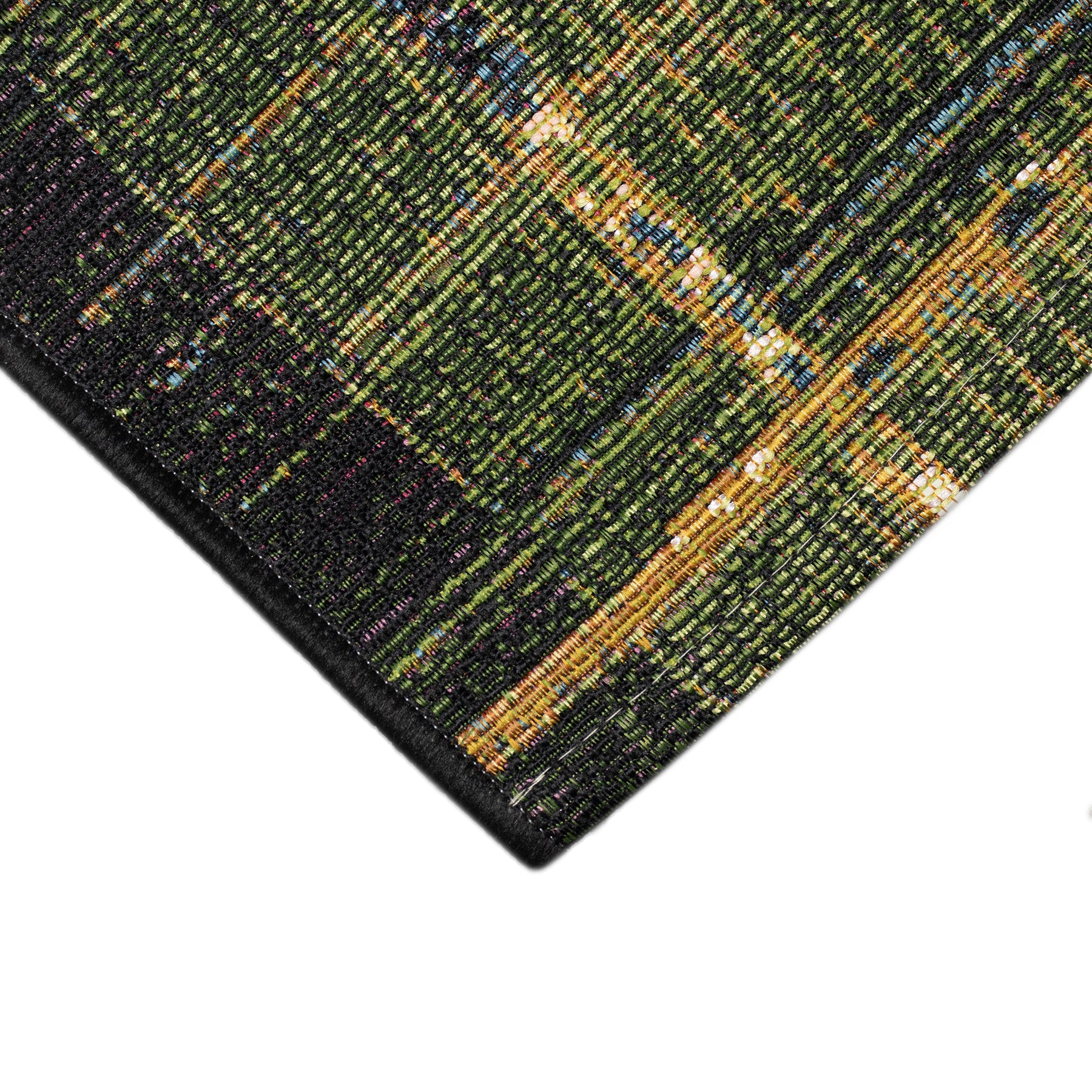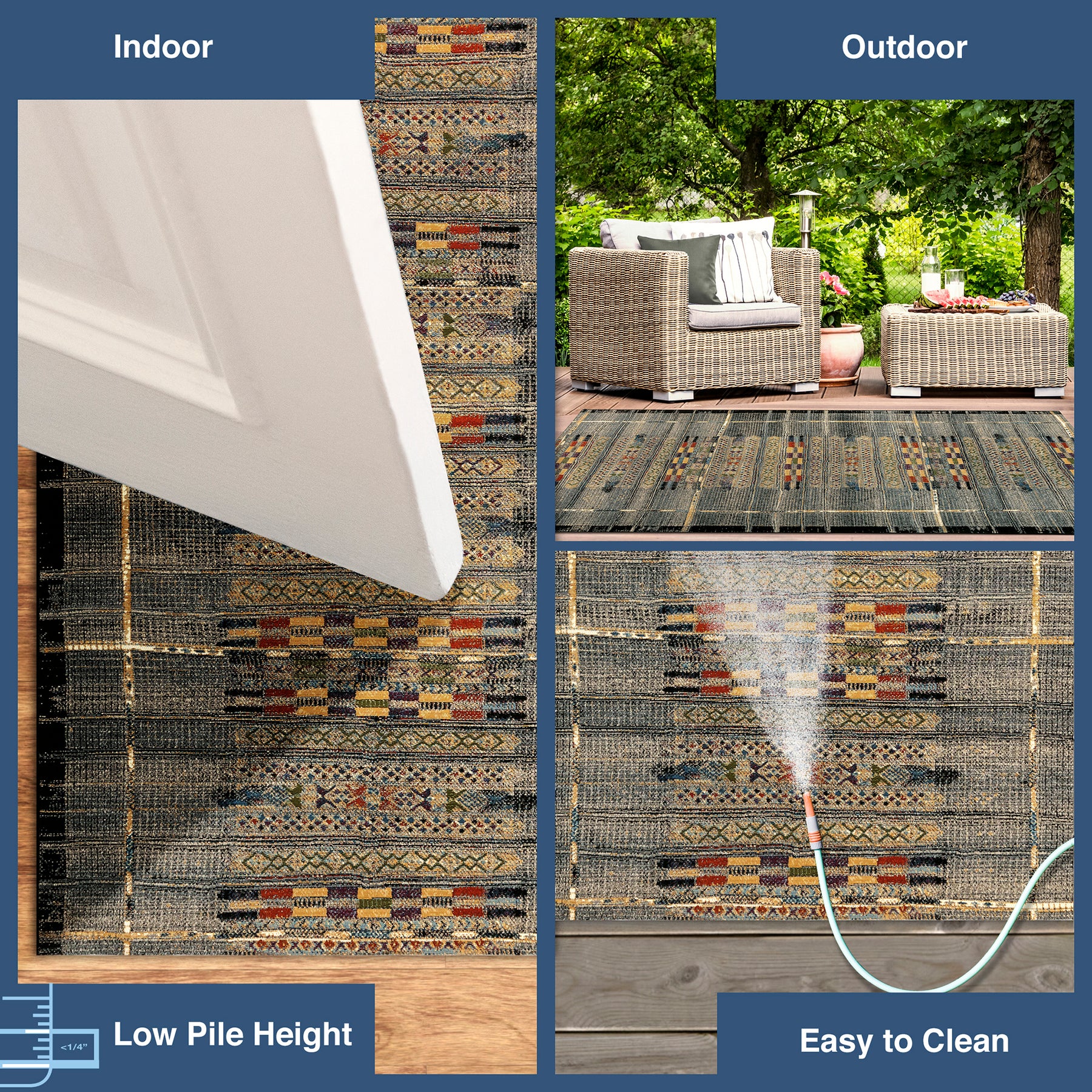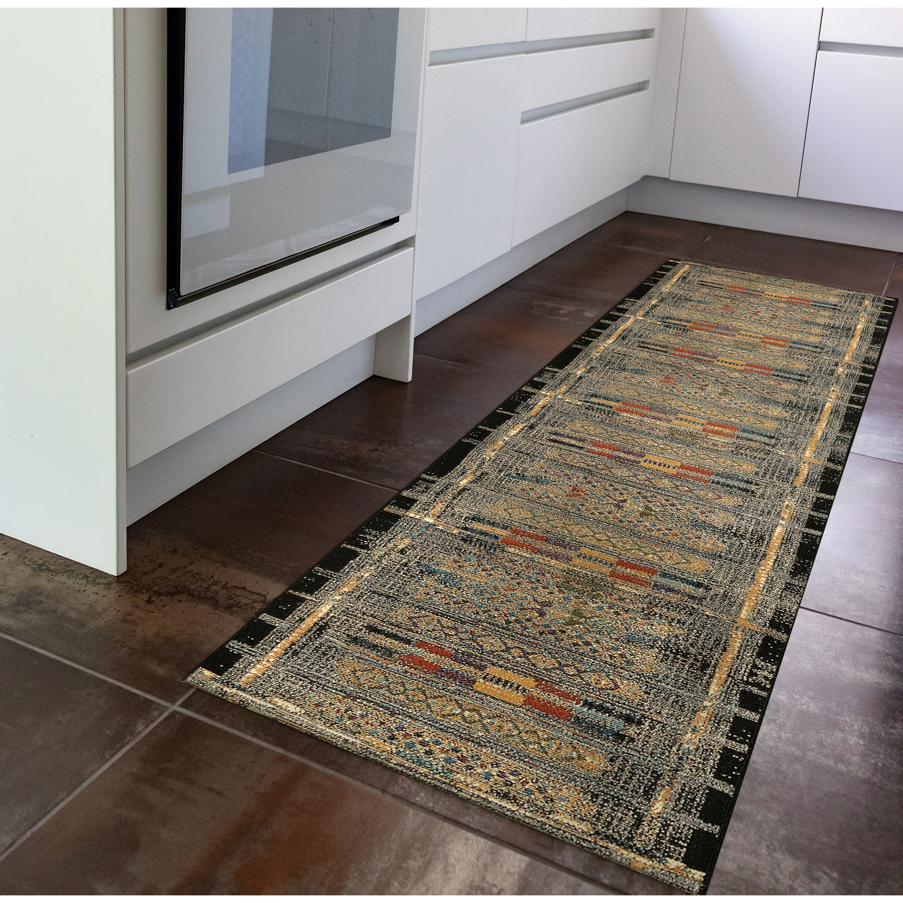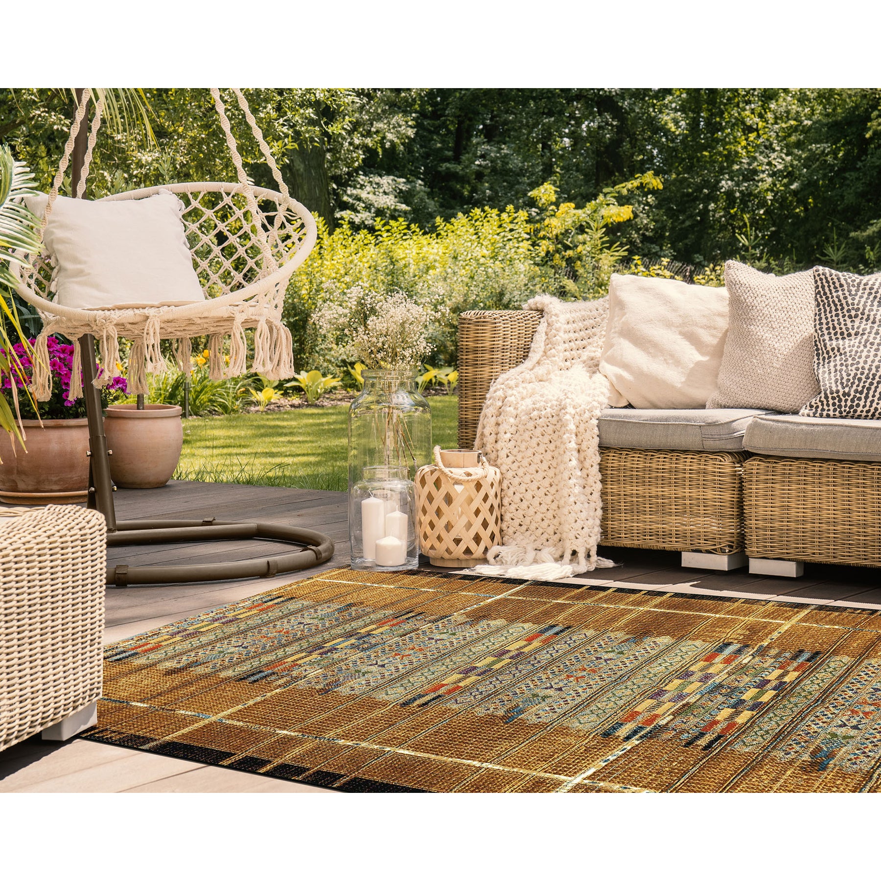 The Tribal Stripe colorful decorative contemporary area rug is inspired by traditional tribal designs that features geometric linear patterns detailed with multiple colors and intricate shapes. The gold background serves to highlight the vivid accent colors in black, orange, green and blue to complement its bold design, making this a truly unique piece for any space inside or outside your home.