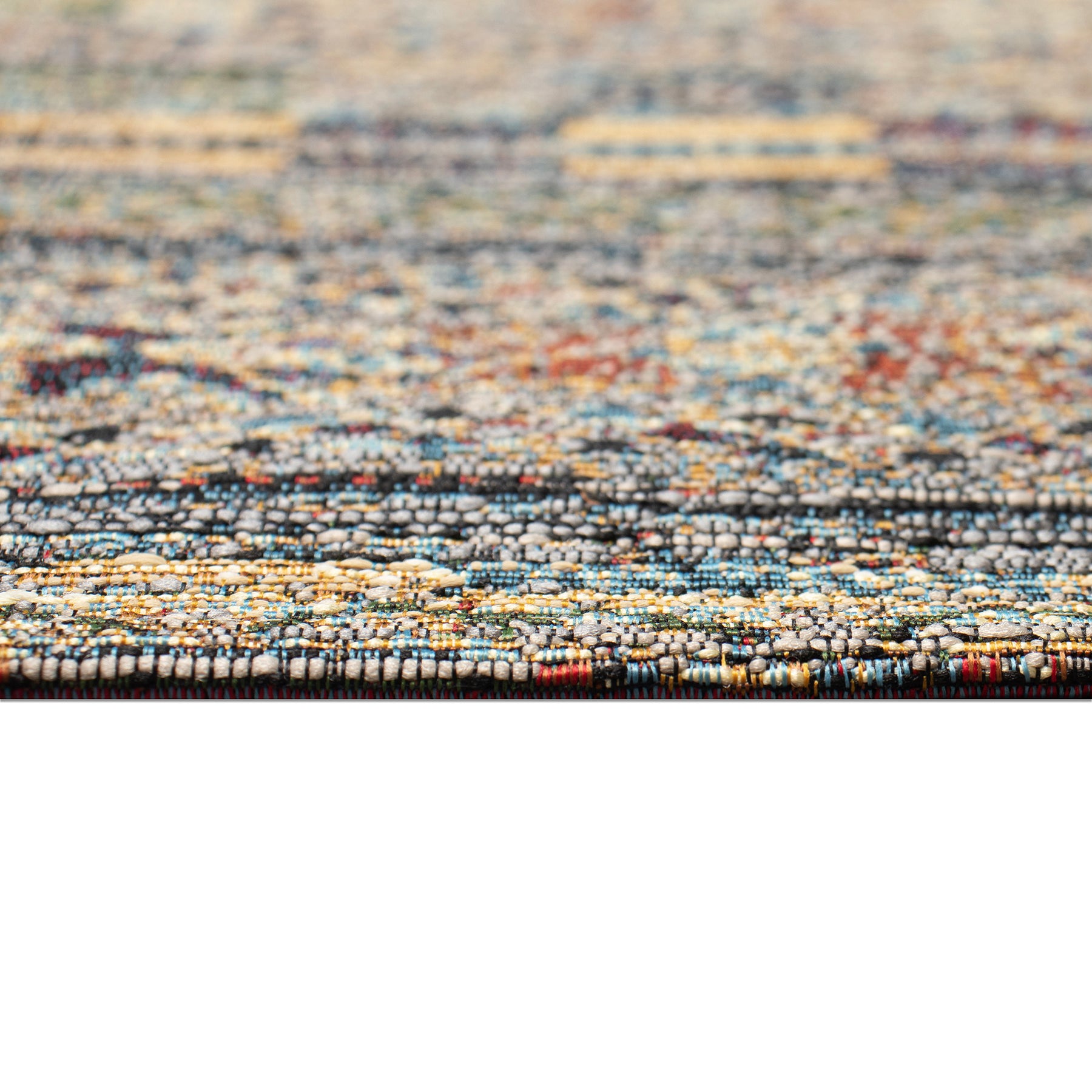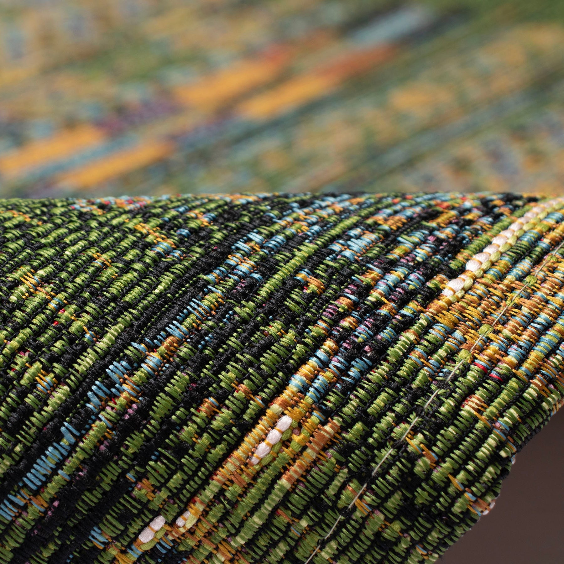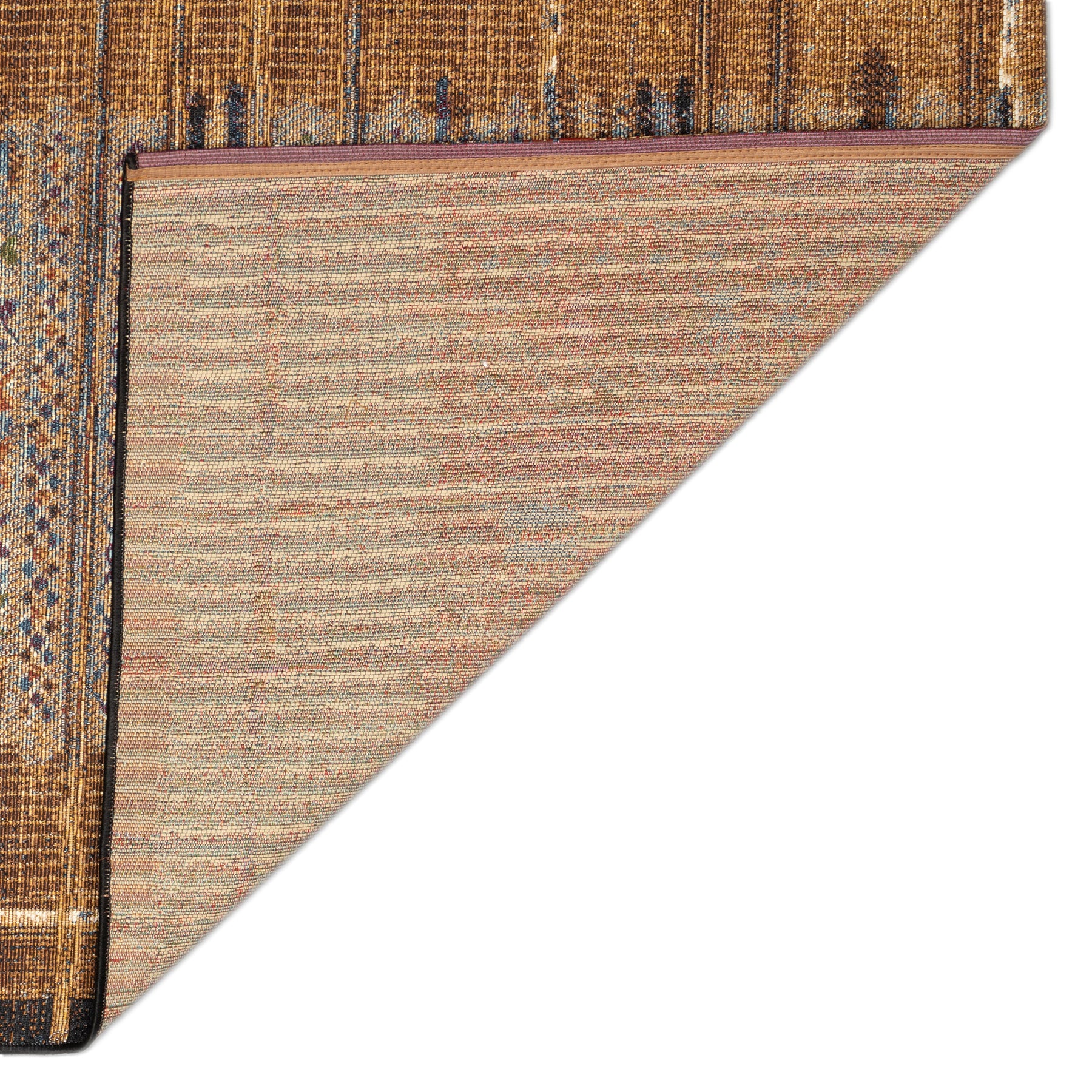 The Tribal Stripe colorful decorative contemporary area rug is inspired by traditional tribal designs that features geometric linear patterns detailed with multiple colors and intricate shapes. The gold background serves to highlight the vivid accent colors in black, orange, green and blue to complement its bold design, making this a truly unique piece for any space inside or outside your home.