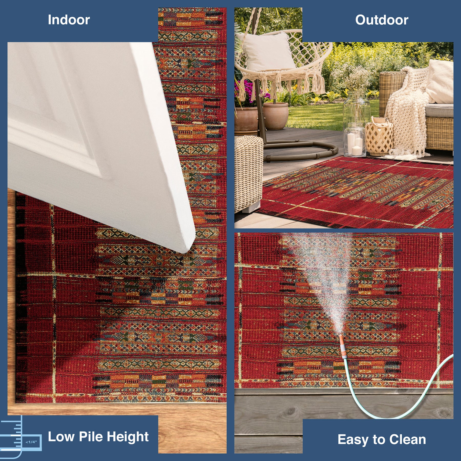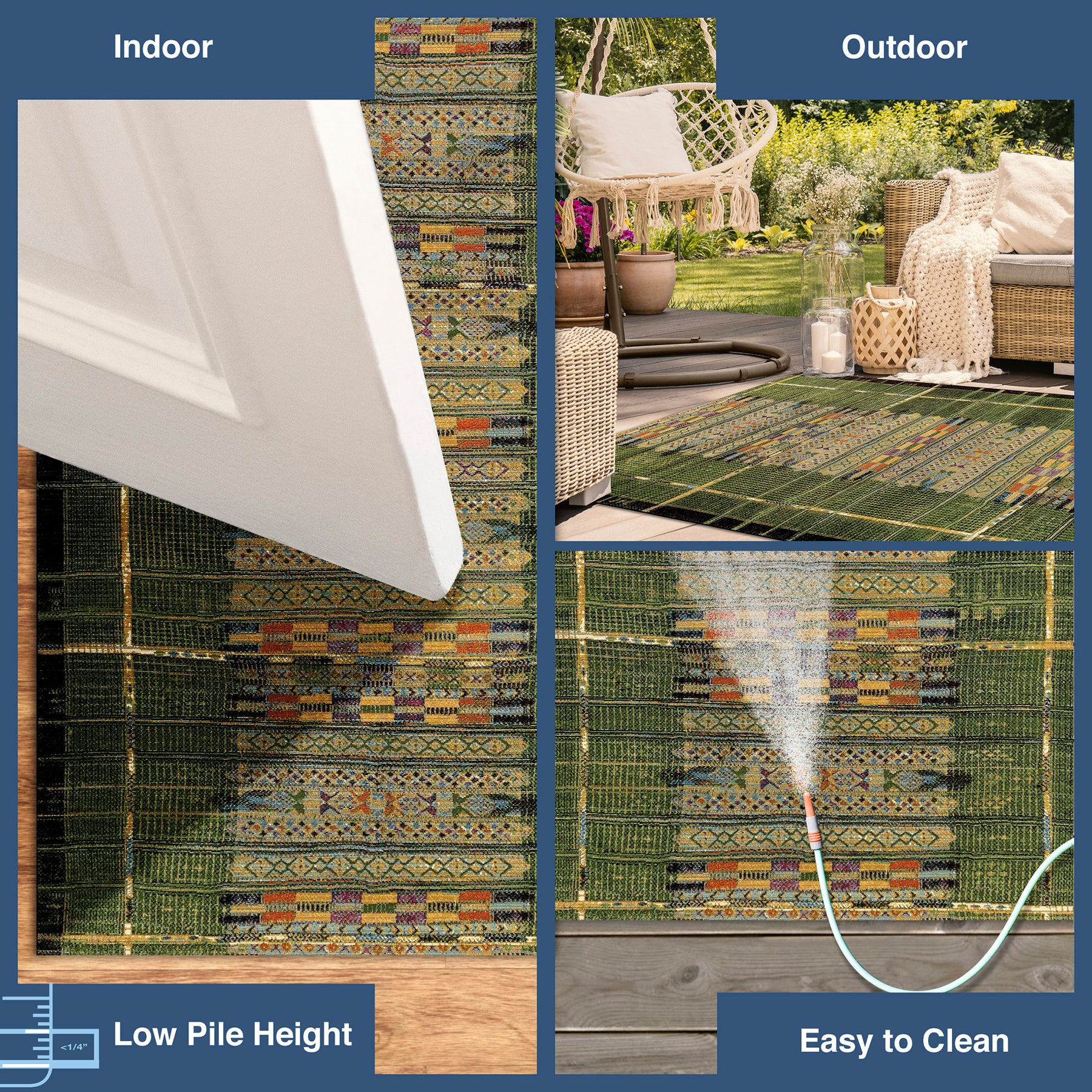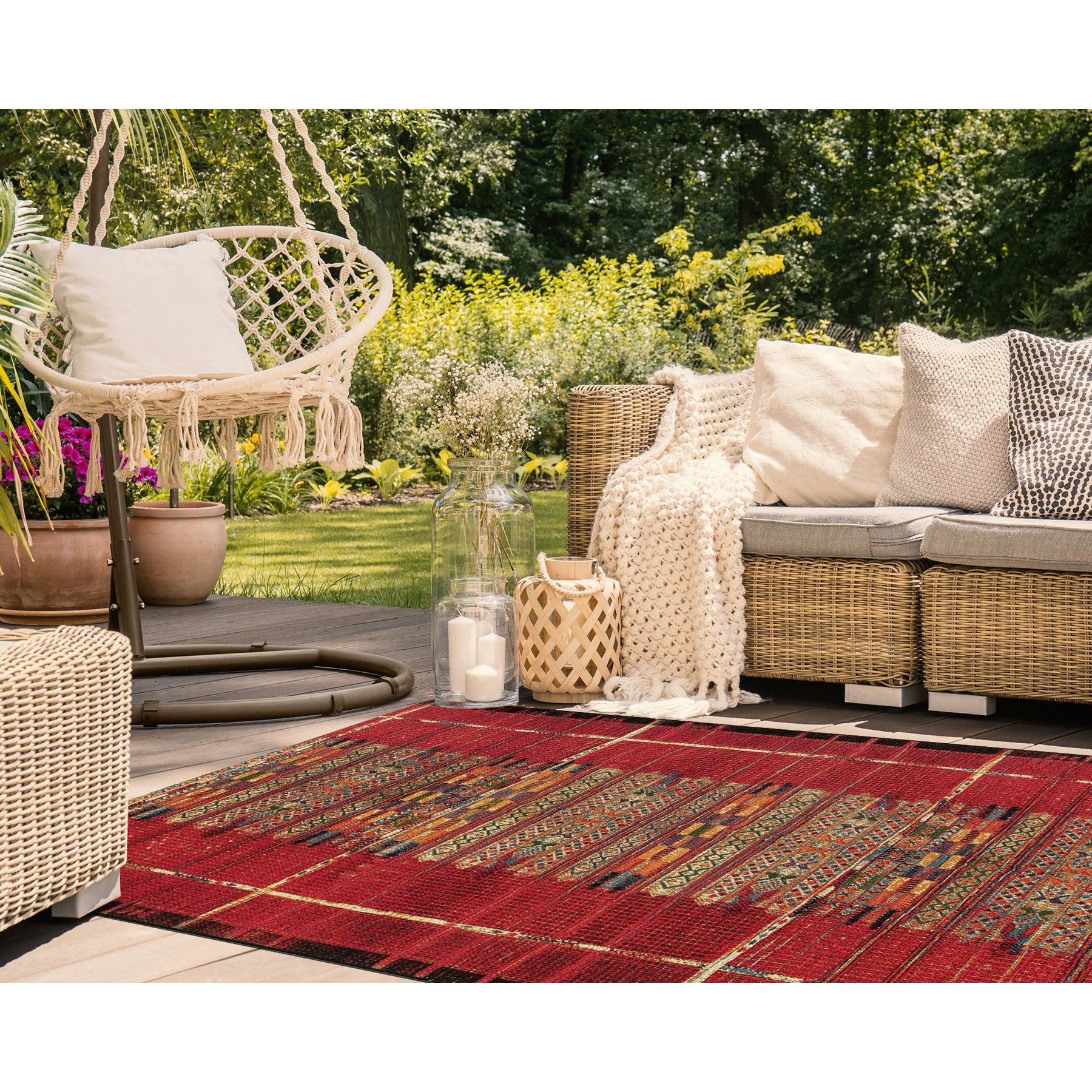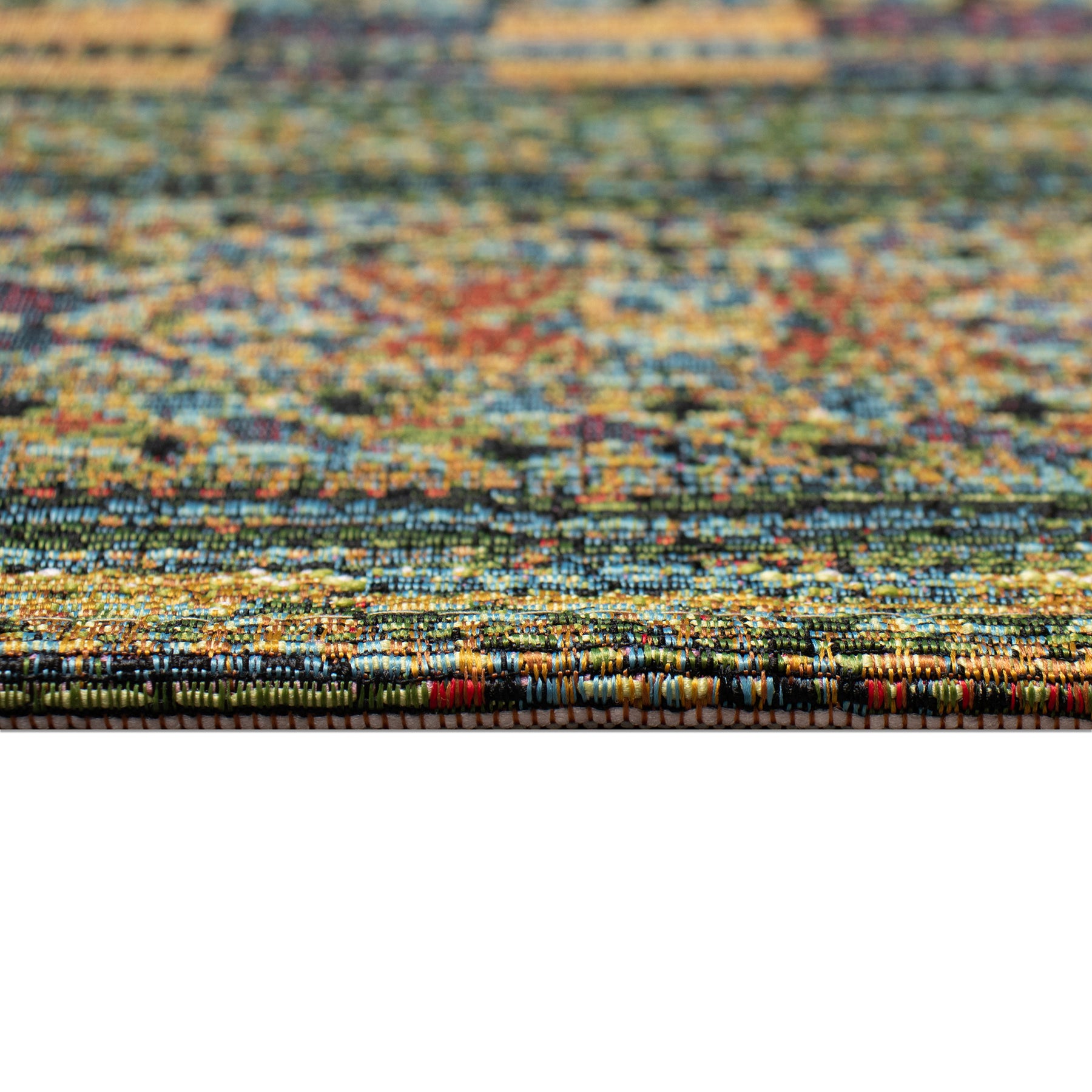 The Tribal Stripe colorful decorative contemporary area rug is inspired by traditional tribal designs that features geometric linear patterns detailed with multiple colors and intricate shapes. The gold background serves to highlight the vivid accent colors in black, orange, green and blue to complement its bold design, making this a truly unique piece for any space inside or outside your home.