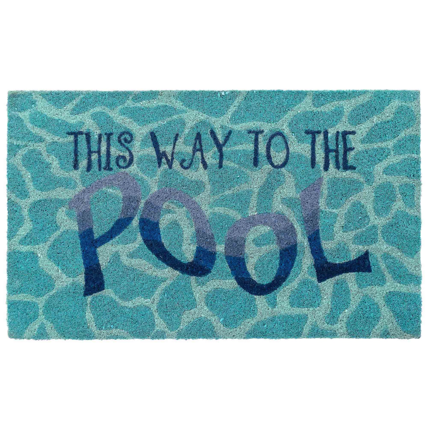 The This Way To The Pool decorative mat features a pool of rippling blue water with a invitation for a dip in the pool written in navy letters.