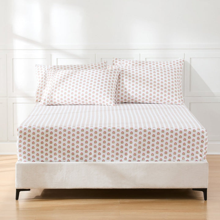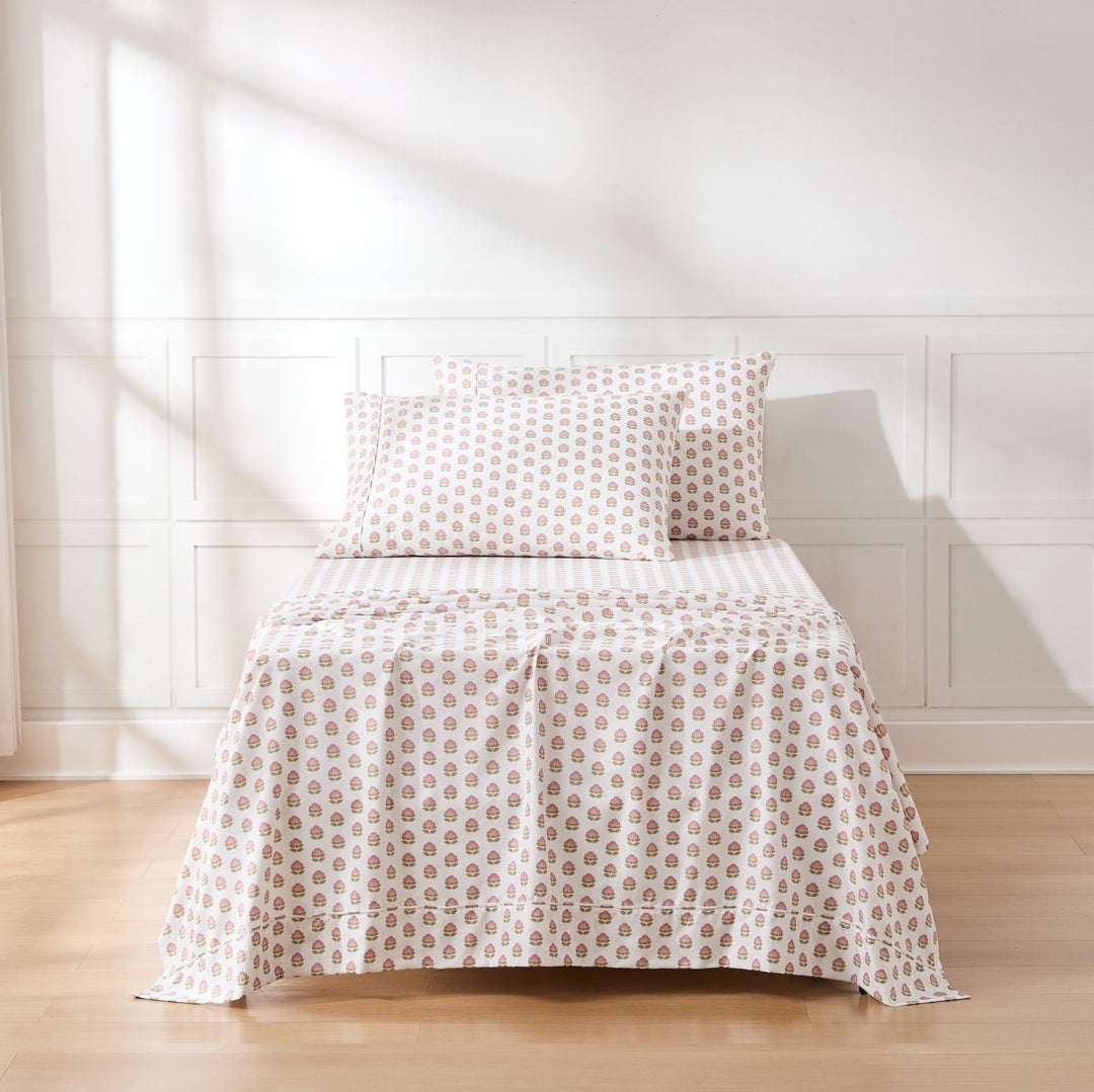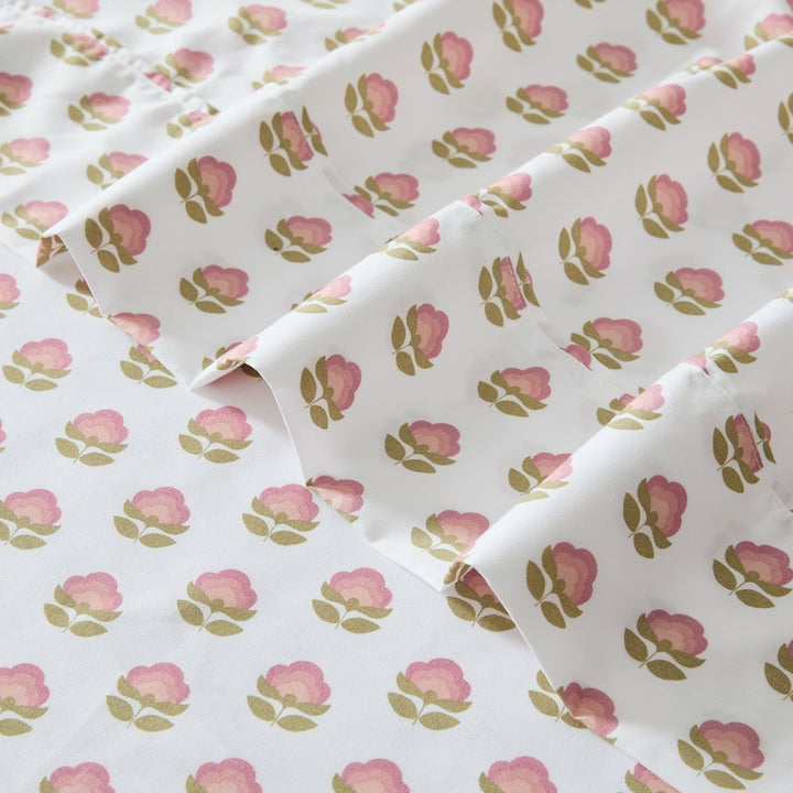 Add playful petals to your decor with this adorable floral bed sheet set. Featuring cute, cartoon-like pink flowers, these soft sheets would complement any cottage, farmhouse, or modern style kids' bedroom. Made with a soft microfiber, this multi-piece set includes 1 flat sheet, 1 fitted sheet with a 14" drop pocket, and 2 or 4 pillowcases. STANDARD 100 by OEKO-TEX® certified, all components have been tested and certified free from harmful substances. Machine washable for easy care.
